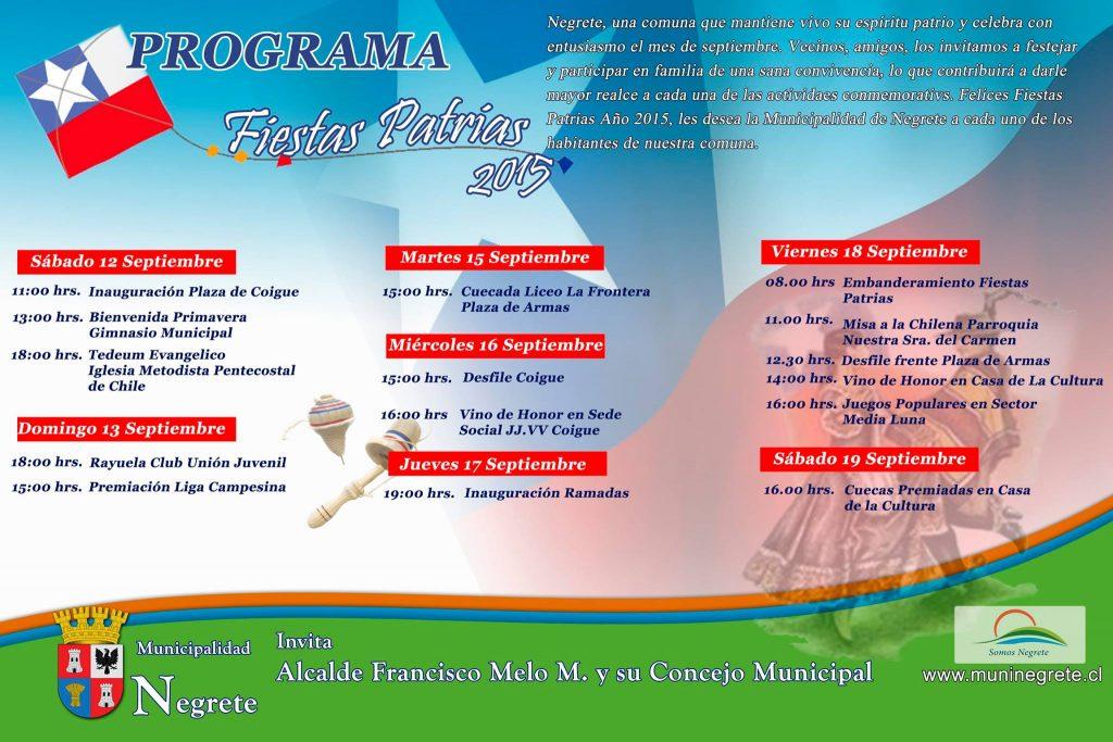 PROGRAMA  ACTIVIDADES  FIESTAS  PATRIAS  AÑO  2015 Negrete,  una comuna que mantiene vivo su espíritu patrio y celebra con entusiasmo el mes de Septiembre. Vecinos, amigos, lo invitamos a festejar y participar en familia de una sana convivencia, lo que  contribuirá a darle un  mayor realce a cada una de las actividades conmemorativas.  Felices Fiestas Patrias