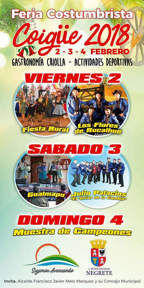 Por su parte, Negrete vibrará con el concurso de carros alegóricos, que premiará con 1 millón de pesos al primer lugar. Además, de una nueva versión del reconocido Festival Aguas del Bío-Bío, que se desarrollará desde el 08 hasta el 10 de febrero, y el que contará con artistas como; Tres pa’ la cueca, Germán Casas, Franco el Gorila, Los Jaivas, Sonora Malecón y Amerikan Sound. Actividades que culminarán con la premiación de la nueva monarca de Negrete.