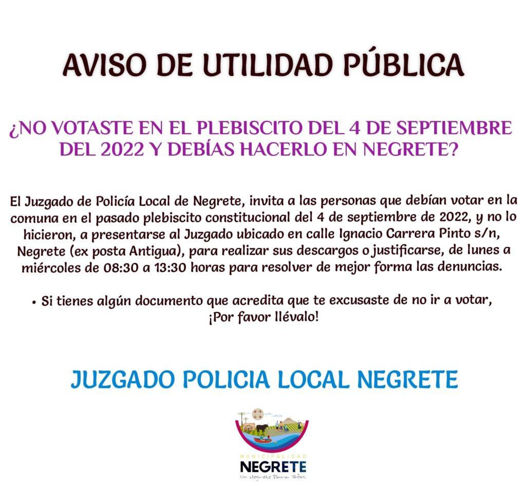El Juzgado de Policía Local de Negrete, invita a las personas que debían votar en la comuna en el pasado Plebiscito Constitucional del 04 de septiembre de 2022, y no lo hicieron, presentarse al Juzgado de Policía Local, ubicado en calle Ignacio carrera Pinto S/N Negrete, para realizar sus descargos o justificarse.
