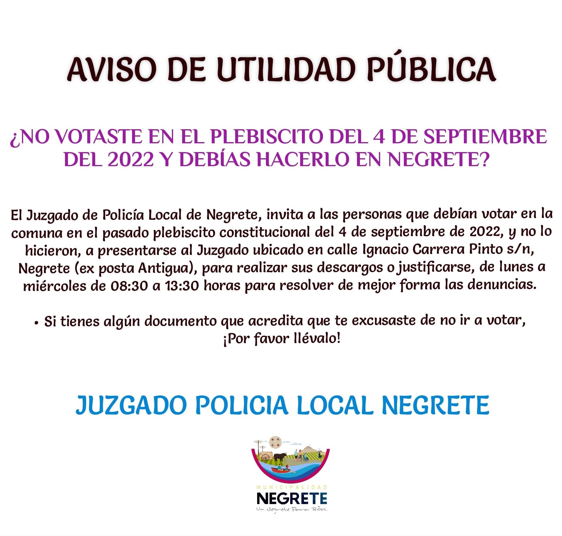 El Juzgado de Policía Local de Negrete, invita a las personas que debían votar en la comuna en el pasado Plebiscito Constitucional del 04 de septiembre de 2022, y no lo hicieron, presentarse al Juzgado de Policía Local, ubicado en calle Ignacio carrera Pinto S/N Negrete, para realizar sus descargos o justificarse.
