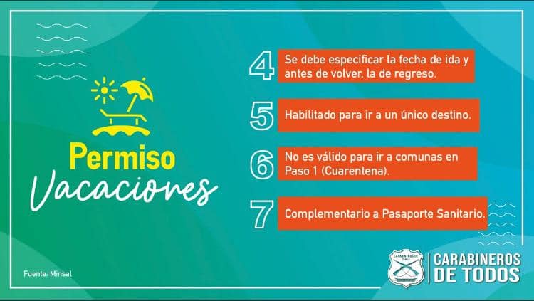 #PermisoDeVacaciones Carabineros de la Tenencia Negrete informa que, a contar del próximo lunes 04 de enero, se habilitará en la Plataforma #ComisariaVirtual un Permiso especial de Vacaciones para quienes viven en comunas de Fase 2. Este permiso solo podrán solicitarlo UNA sola vez hasta el 31 de marzo de 2021.